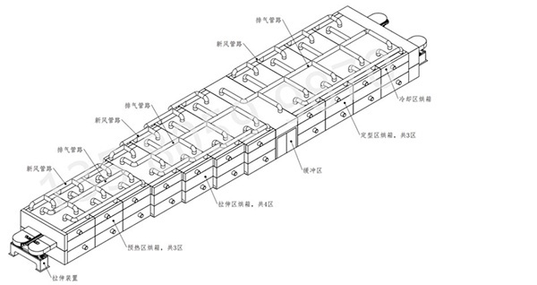 在橫拉設(shè)備中烘箱主要為薄膜預(yù)熱、拉伸、定型、冷卻過程中提供一個密閉保溫的空間,并且烘箱內(nèi)部按區(qū)域功能及一定間距為由隔斷板間隔開。